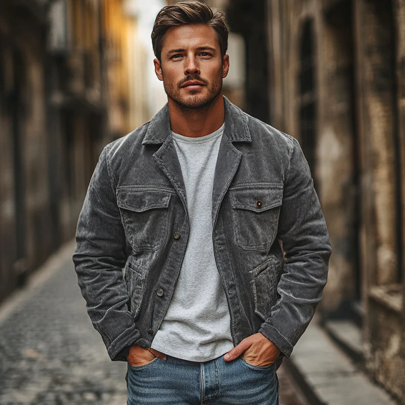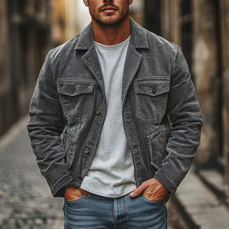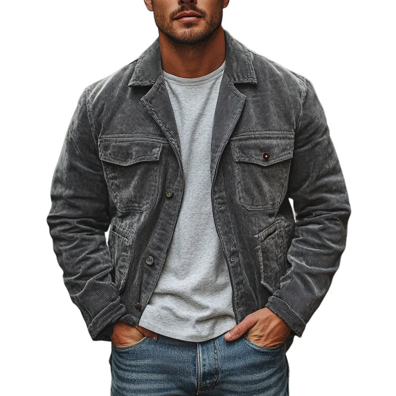 Men's Vintage Gray Corduroy Lapel Multi-Pocket Jacket