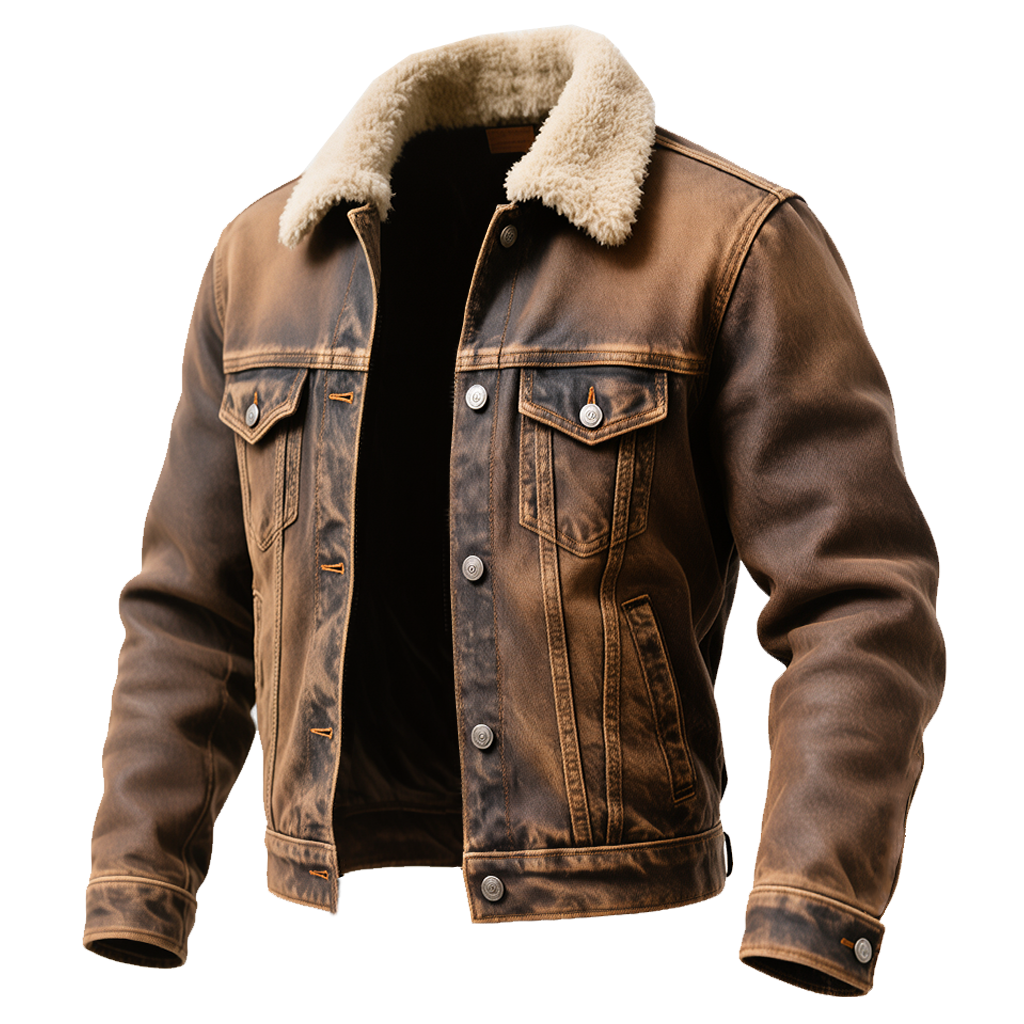 Men's Vintage Brown Denim Jacket With Faux Shearling Collar