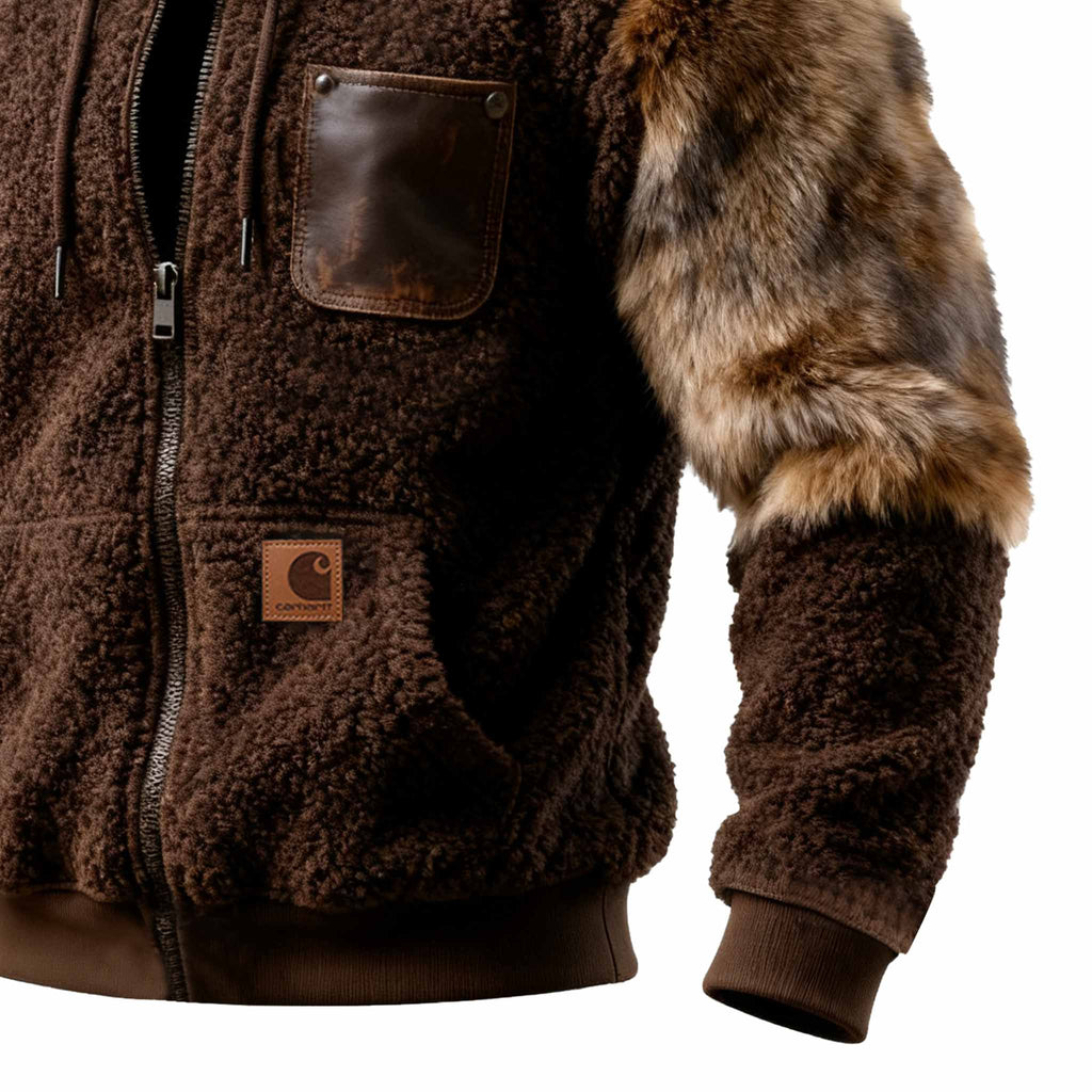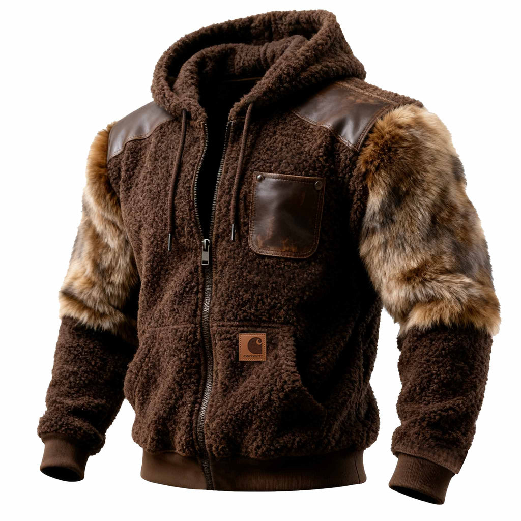 Men's Vintage Warm Brown Polar Fleece Leather Fur Sherpa-Lined Hooded Jacket