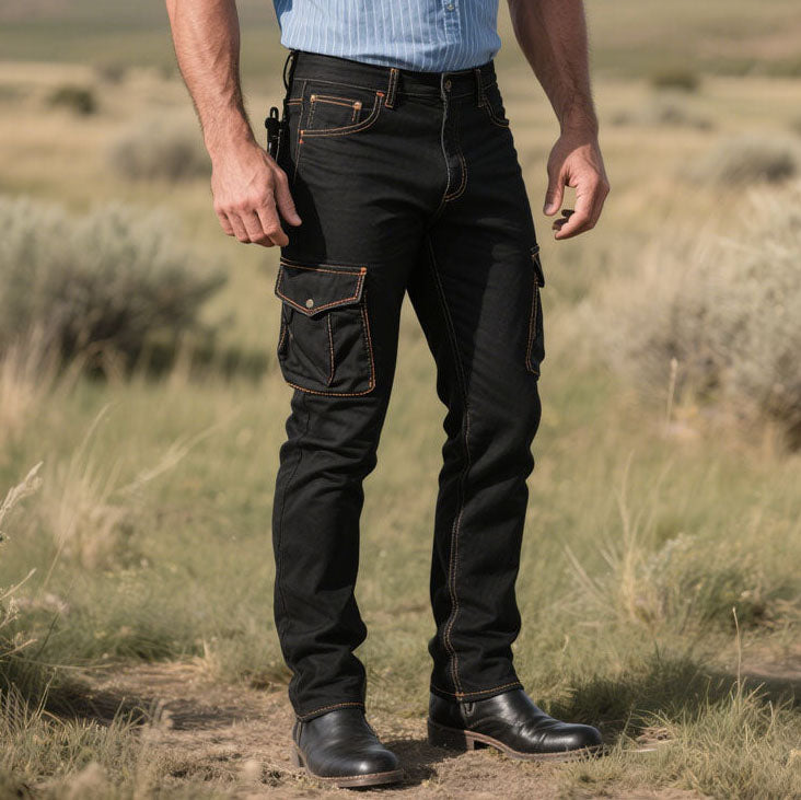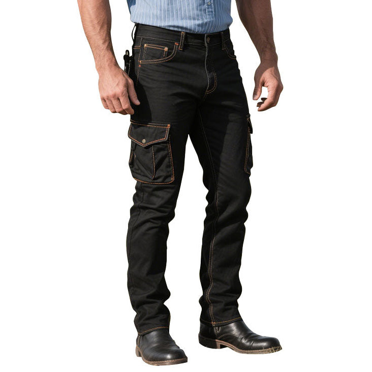 •    Design Elements: Orange stitching accents, multiple utility pockets, slim fit design