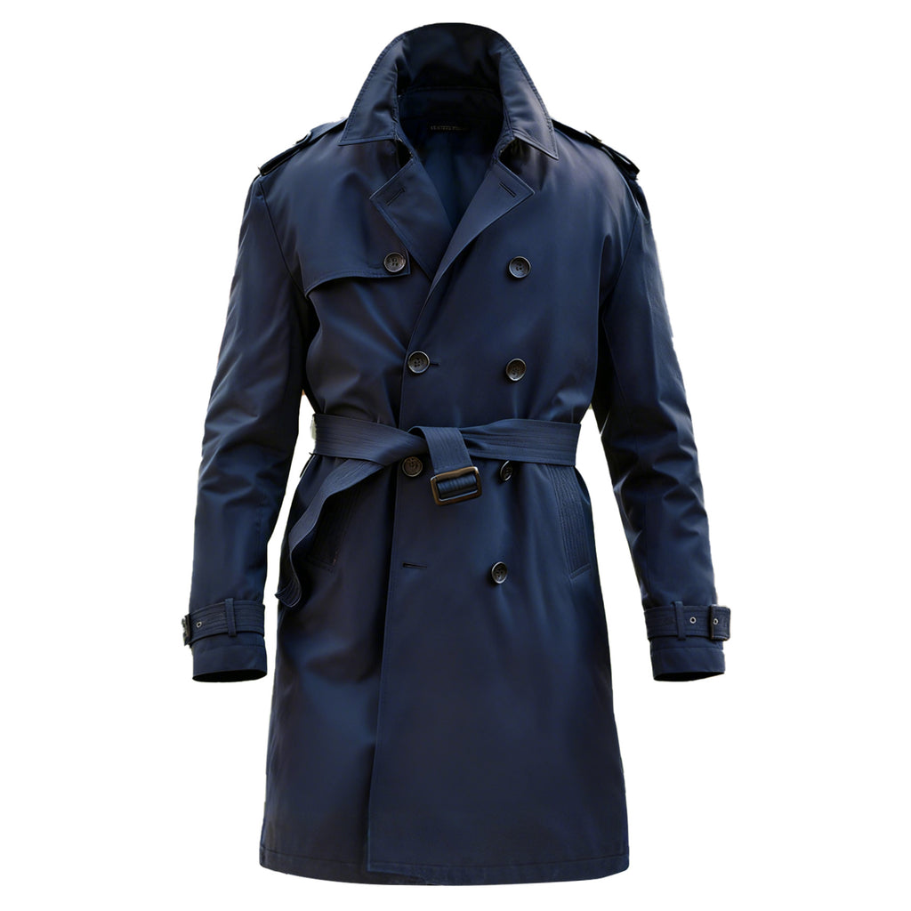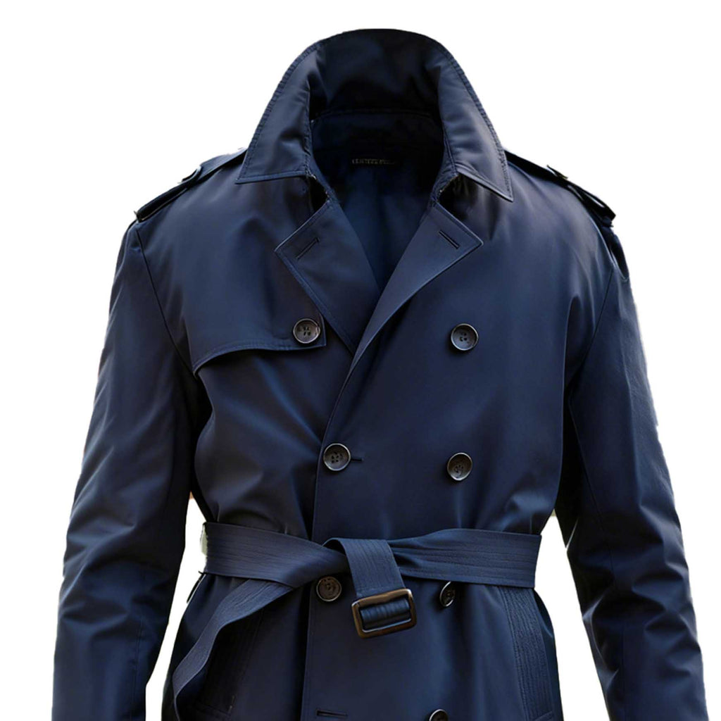 Men's Vintage Navy Blue Double-Breasted Trench Coat With Belted Waist