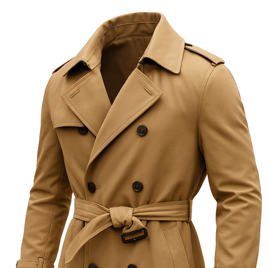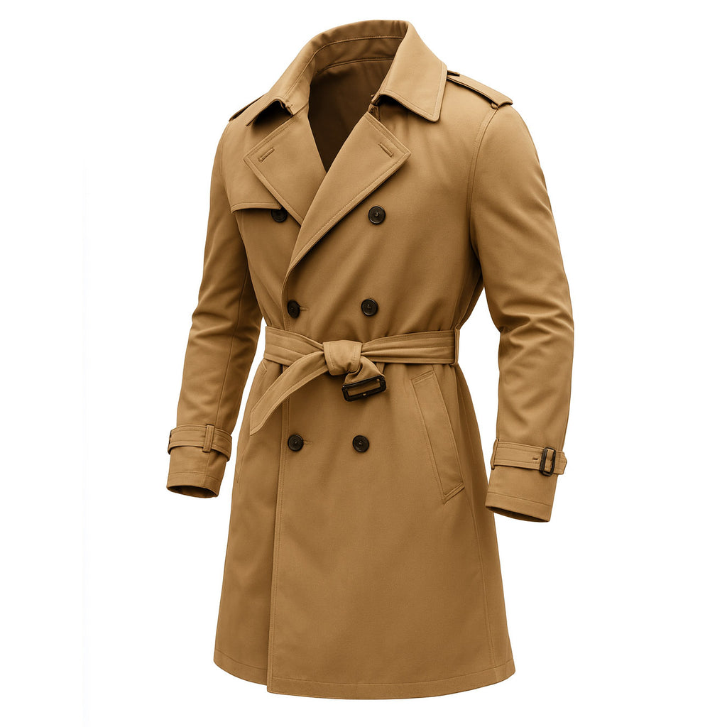 Men's Vintage Khaki Double-Breasted Trench Coat With Belted Waist