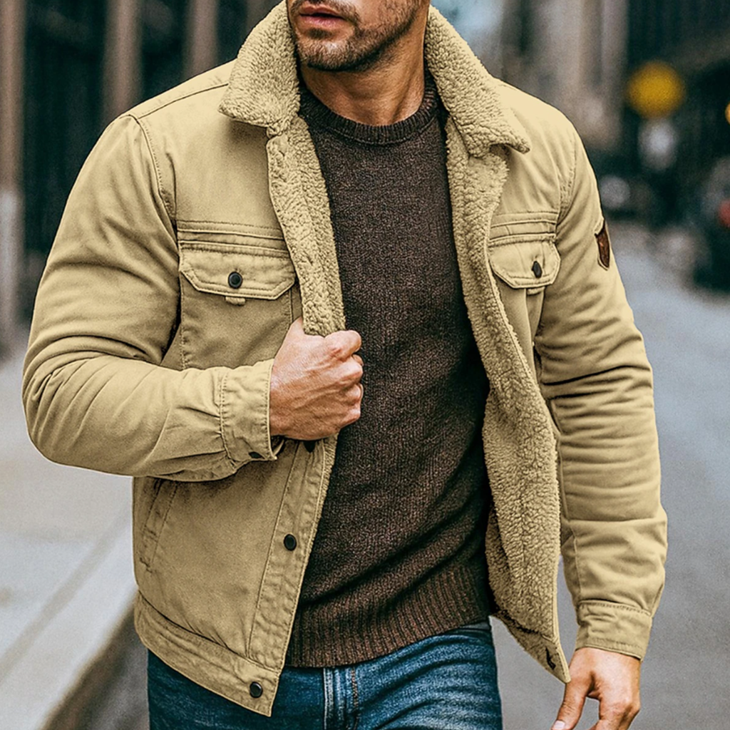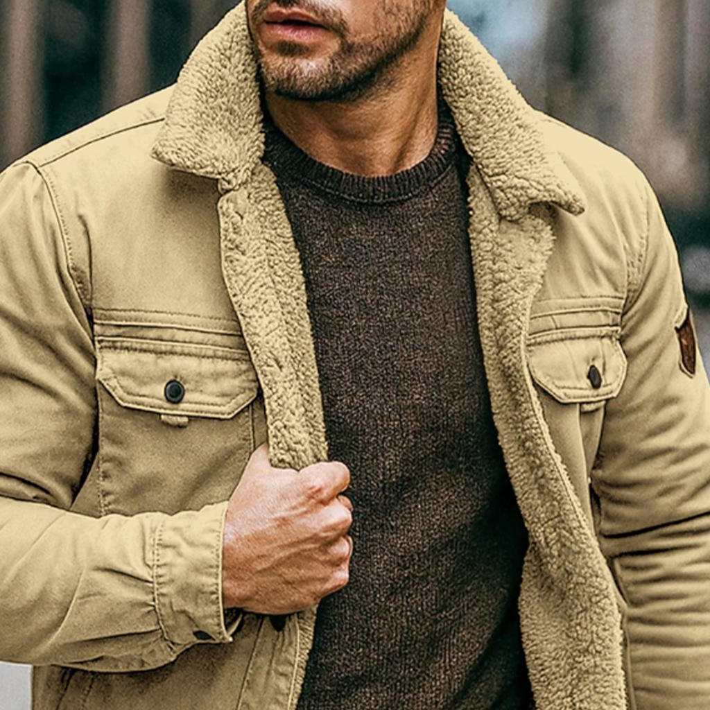 Men's Vintage Casual Khaki Jacket With Sherpa Lining And Brown Sweater
