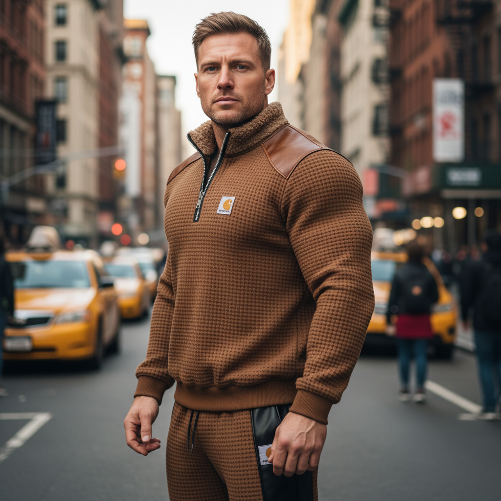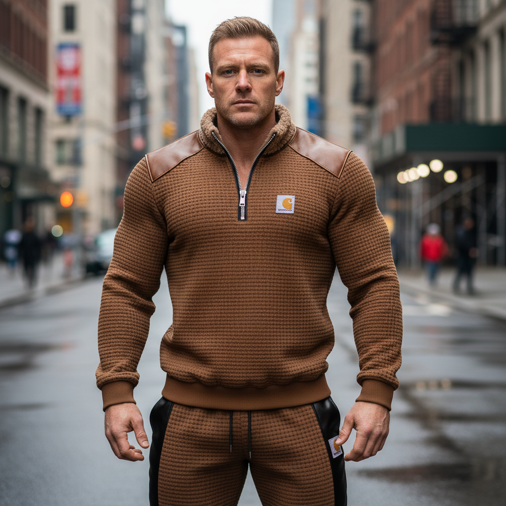 Men's Retro Casual Brown Waffle Knit Tracksuit With Leather Accents