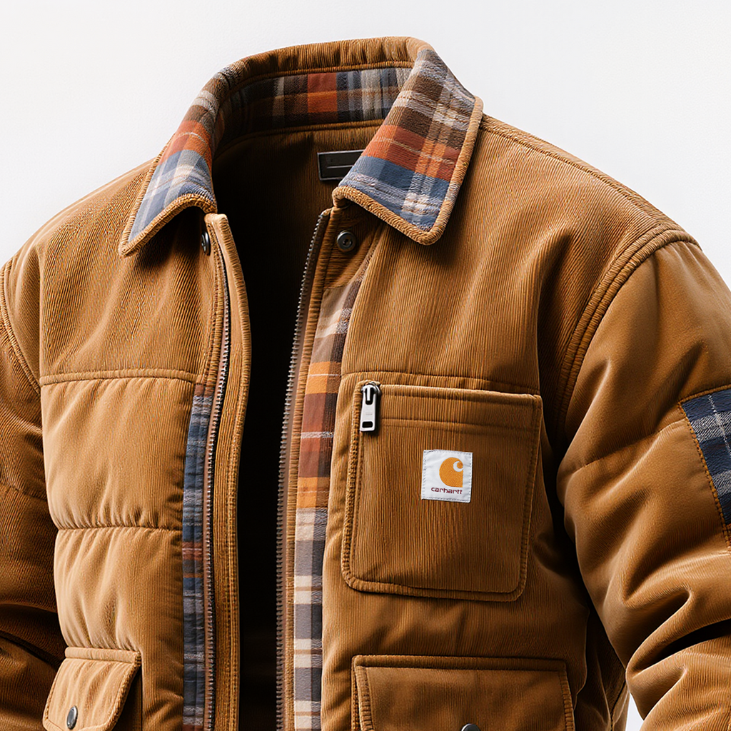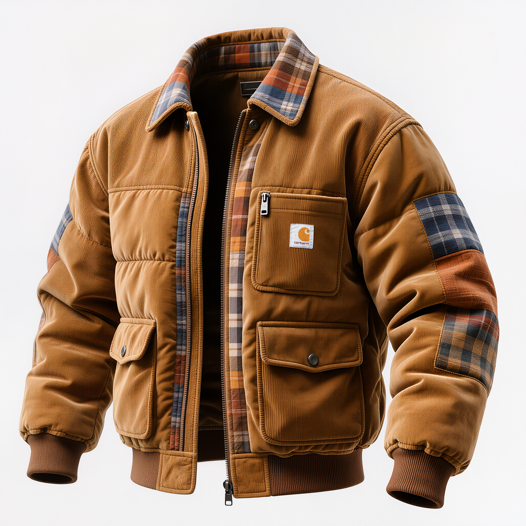 • Design Elements: Plaid inner lining, zippered chest pocket, patchwork sleeves