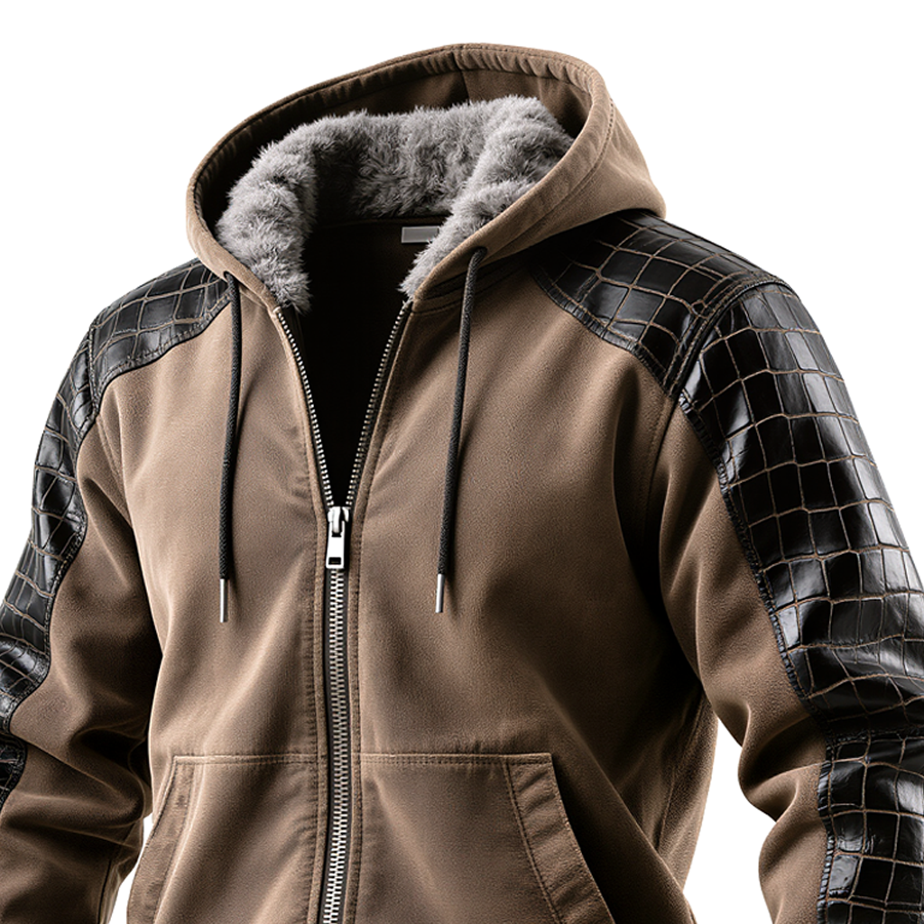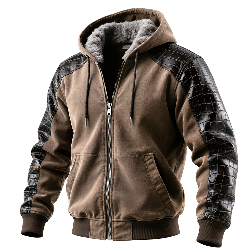 Men's Brown Hooded Jacket With Crocodile Leather Sleeves And Faux Fur Lining