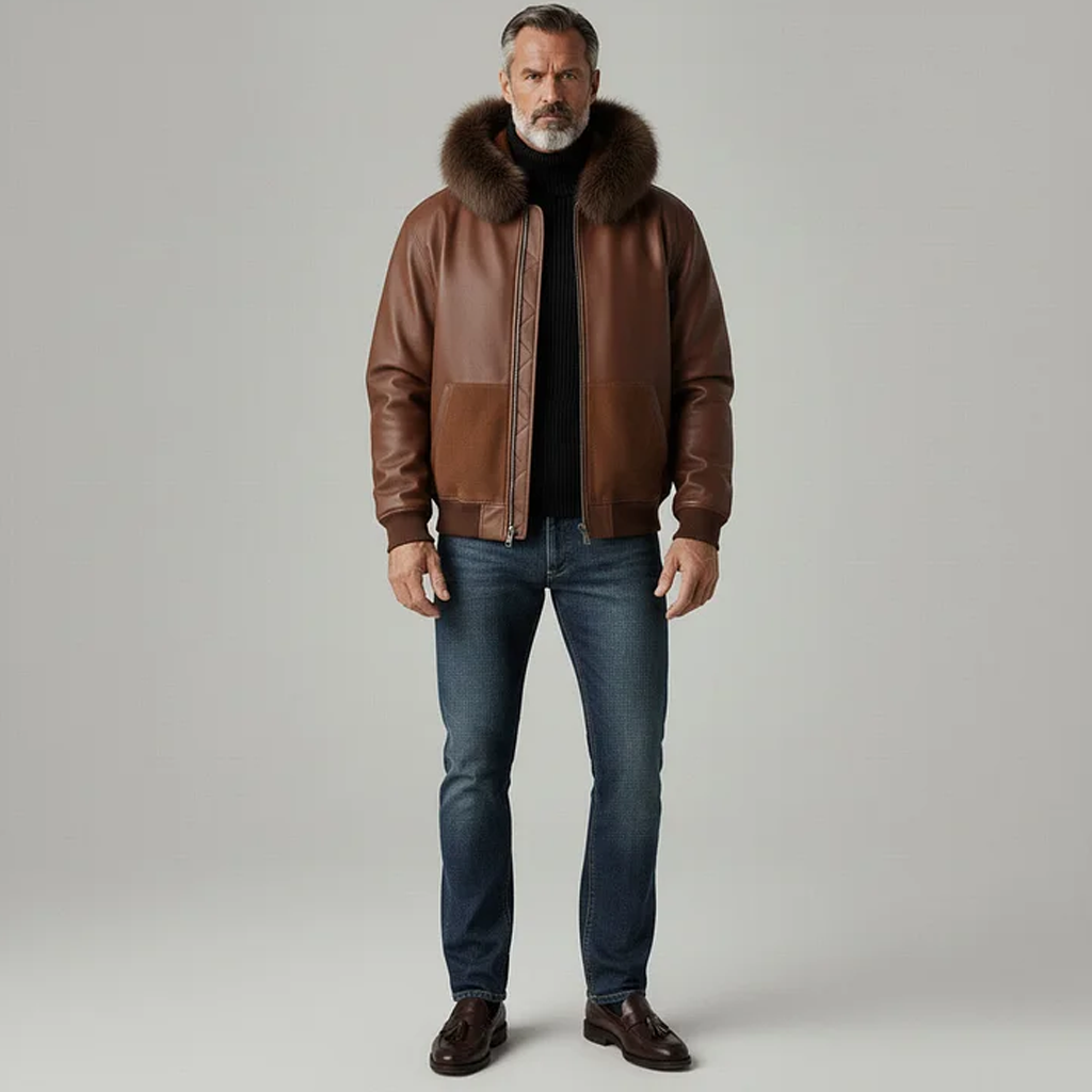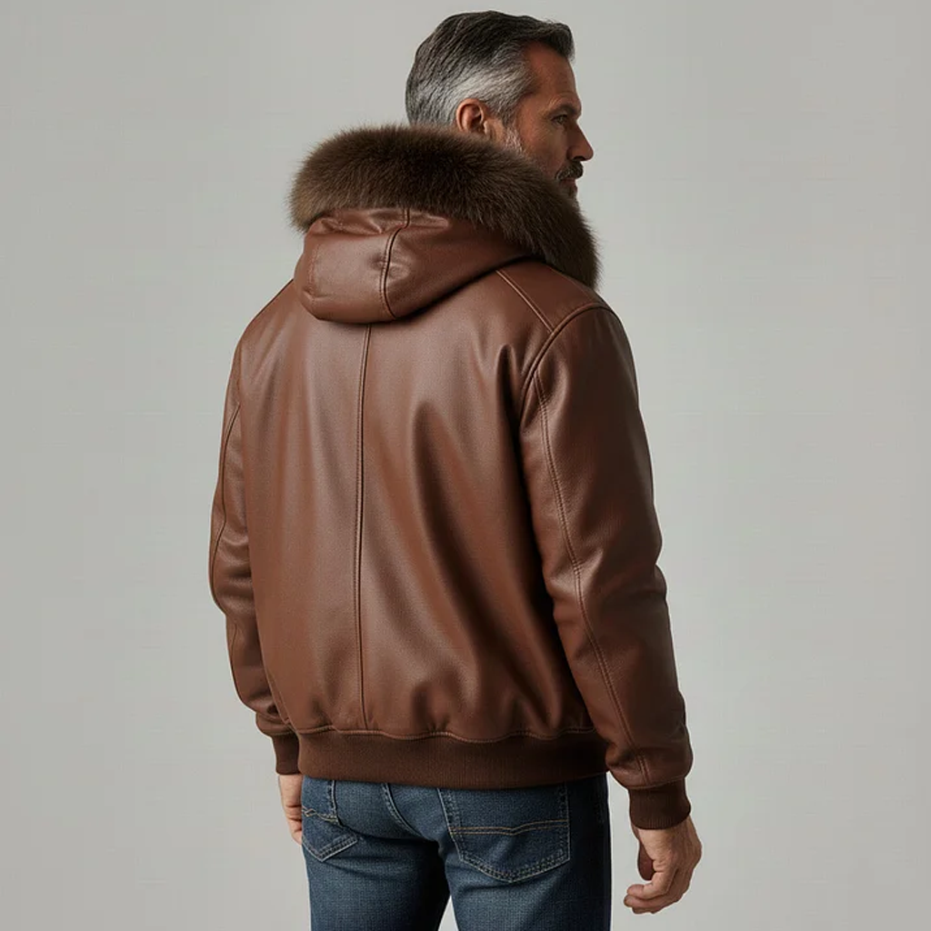 Men's Retro Brown Leather Jacket With Fur Hood