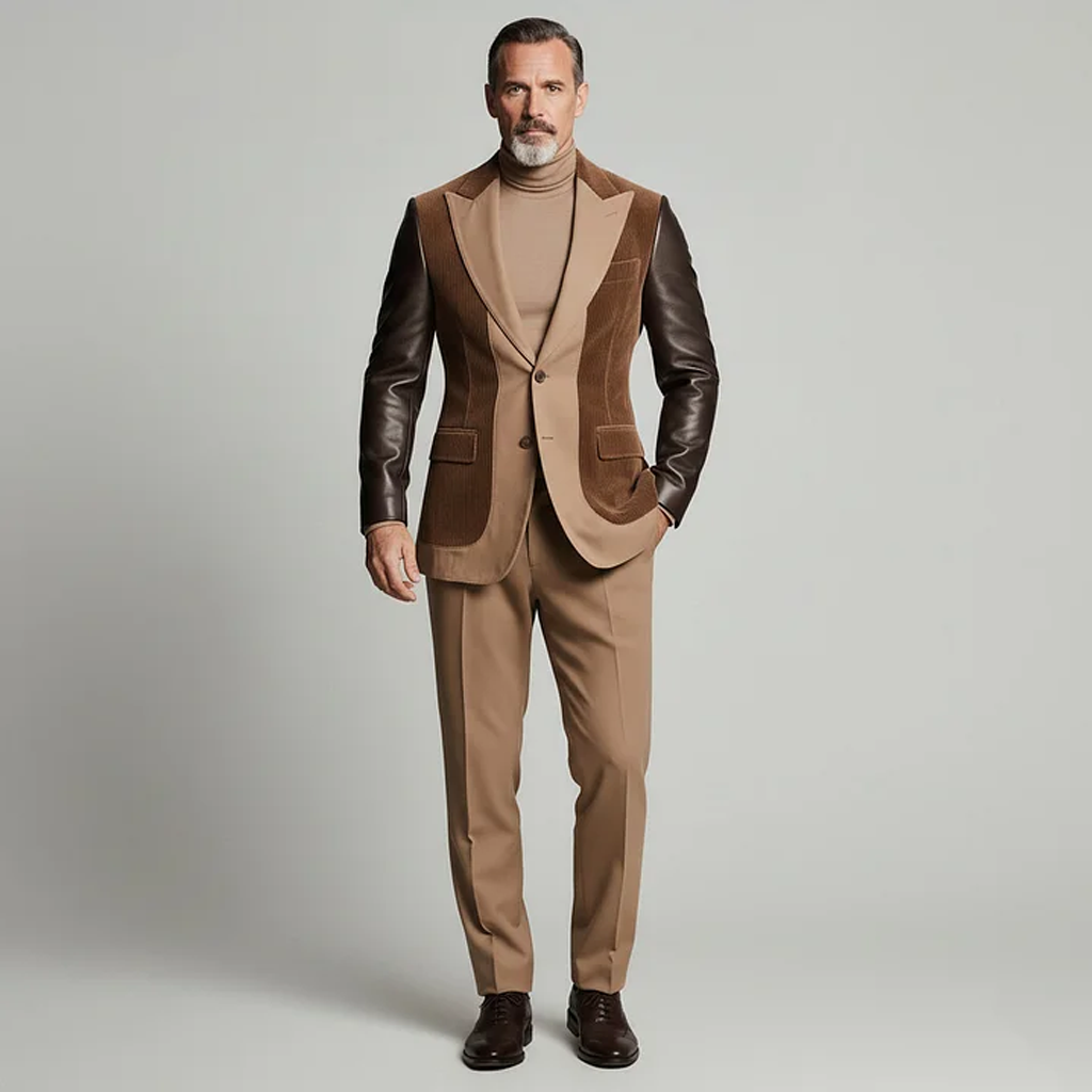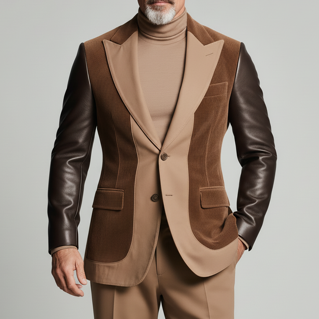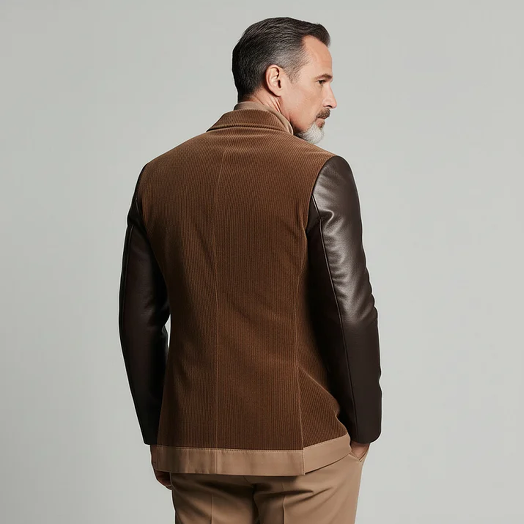 • Design Elements: Contrasting Leather Sleeves, Notched Lapel, Two-Button Closure