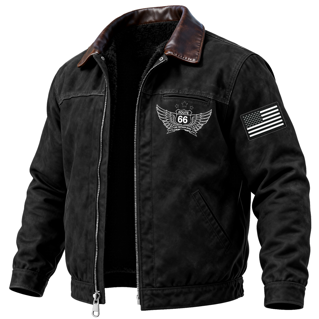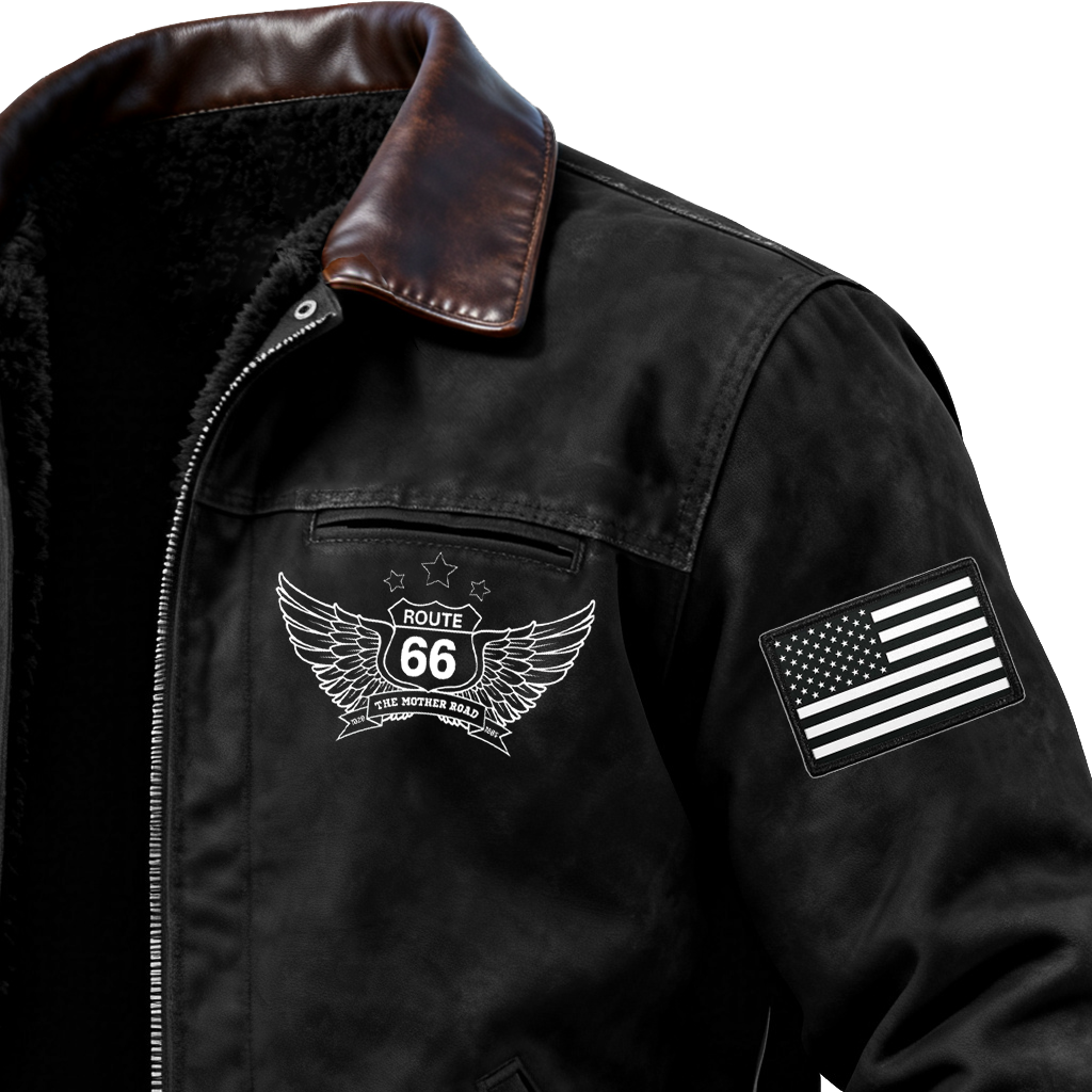 • Design Elements: Embroidered Route 66 emblem, American flag patch on sleeve, vintage-inspired collar