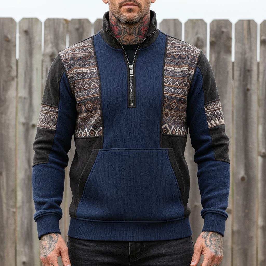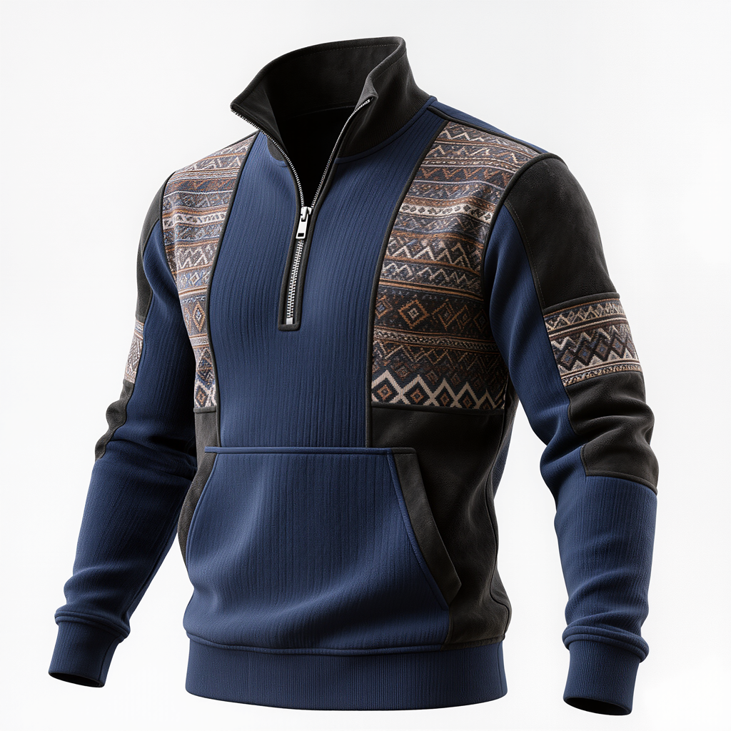 • Design Elements: Geometric Tribal Print, Color-Blocked Panels, Zippered Front