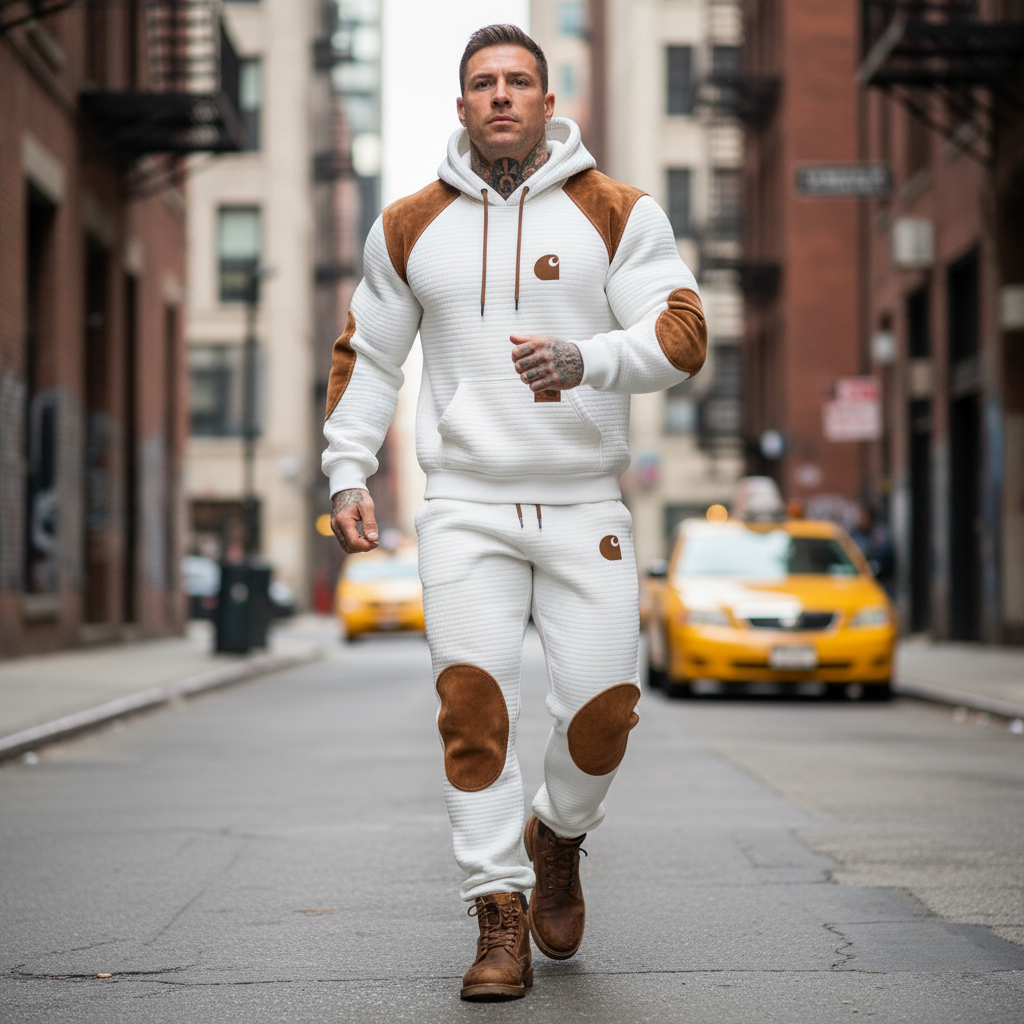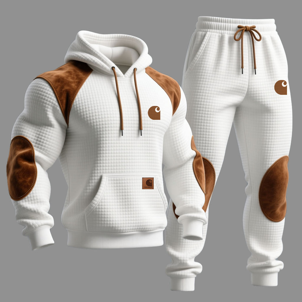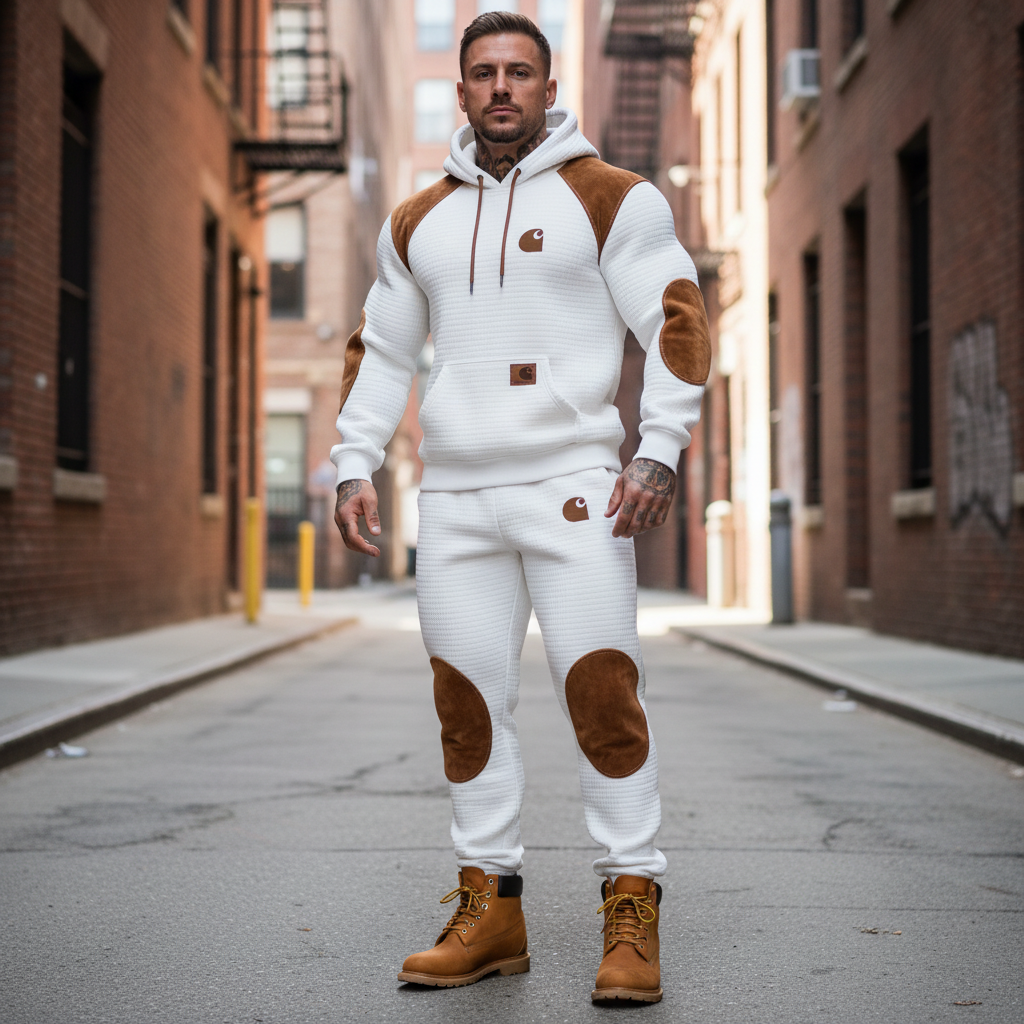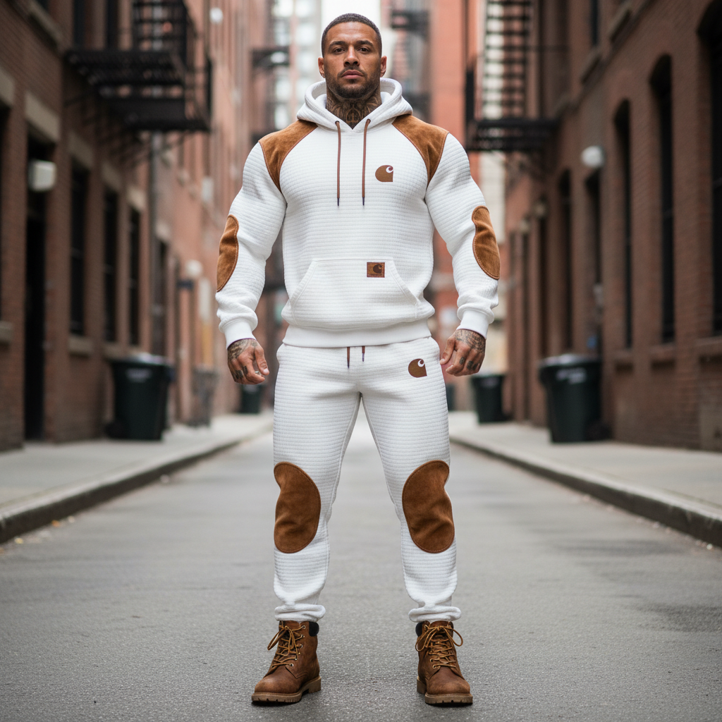 Men's Vintage White Waffle Quilted Plaid Stitching Brown Suede Pocket Hoodie And Sweatpants Jogger Set