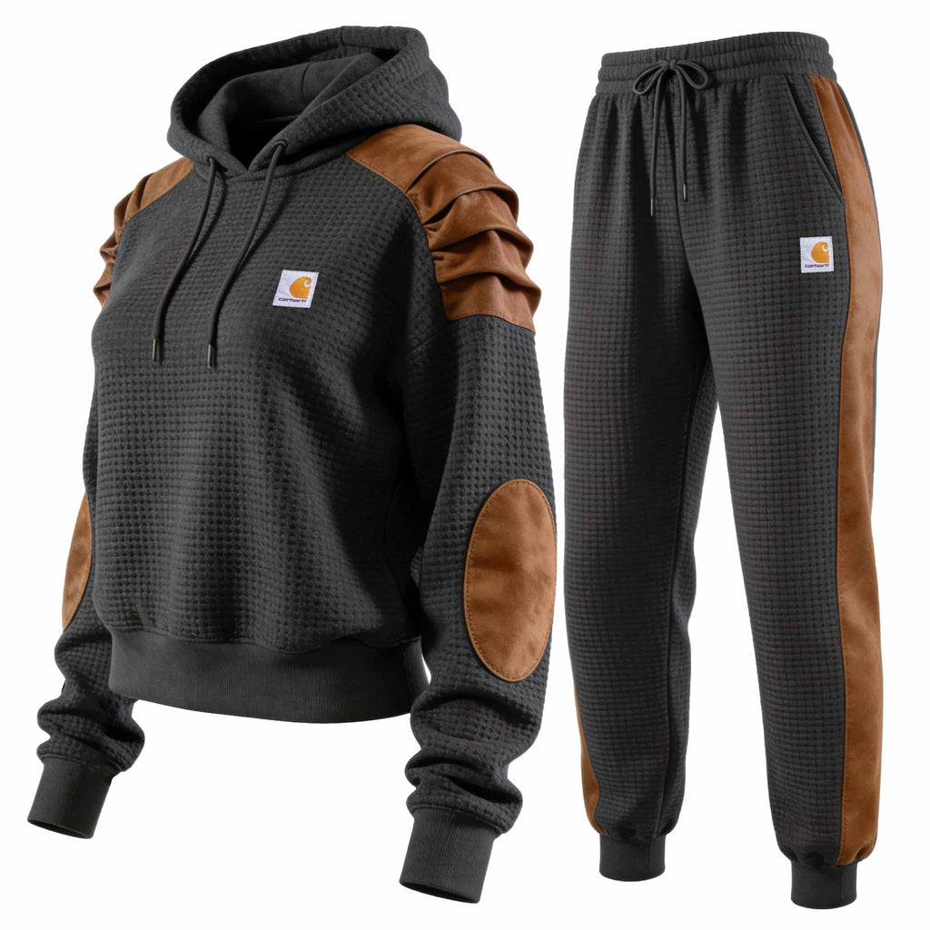 Women's Vintage Dark Gray Waffle Splicing Brown Suede Hoodie And Sweatpants Set