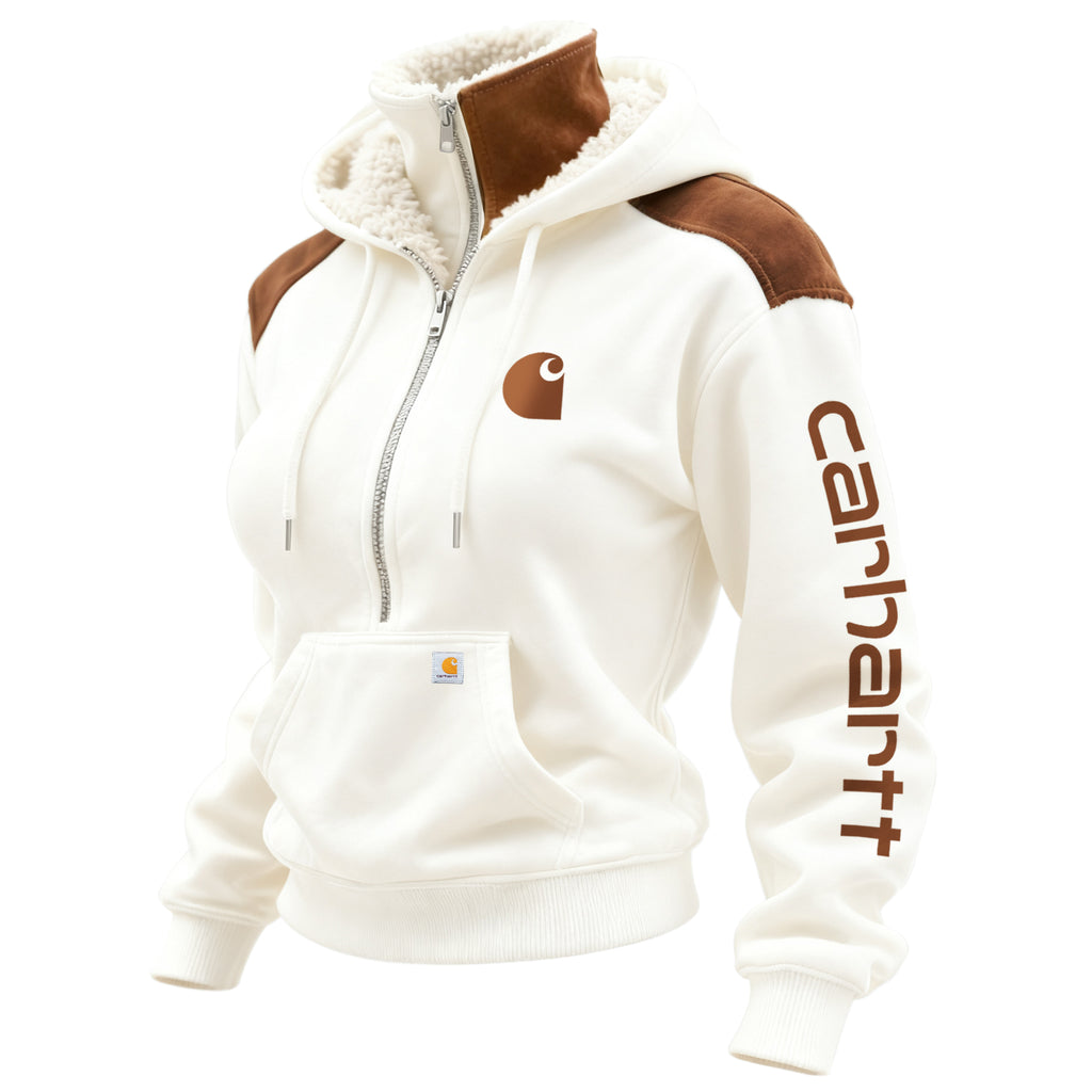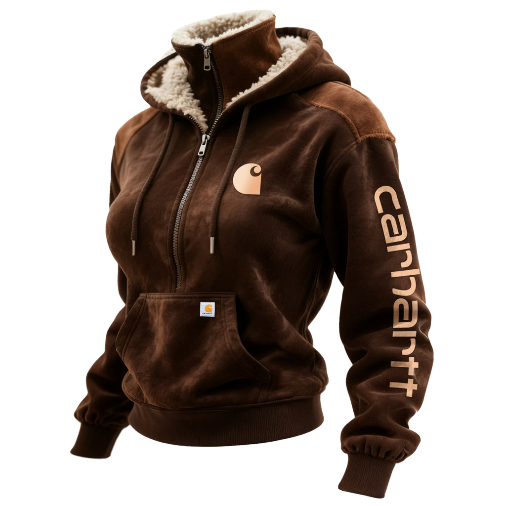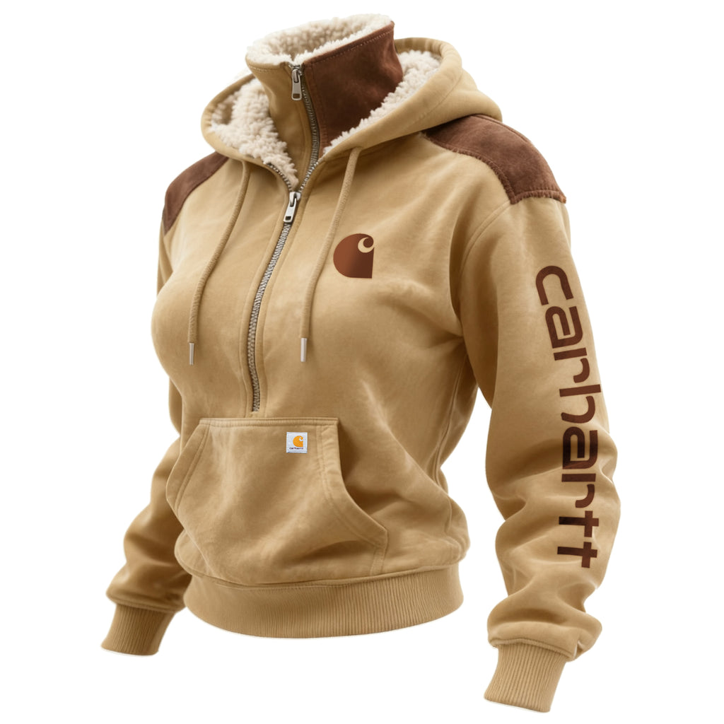 Retro Western Style Women's Contrast Color Panel Suede Hooded Sweatshirt Half Zip Stand Collar Sweatshirt