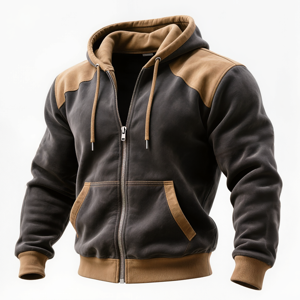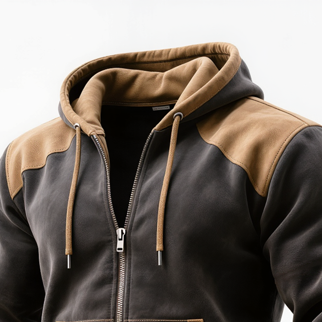 Brown And Black Leather-Style Hoodie With Contrast Panels