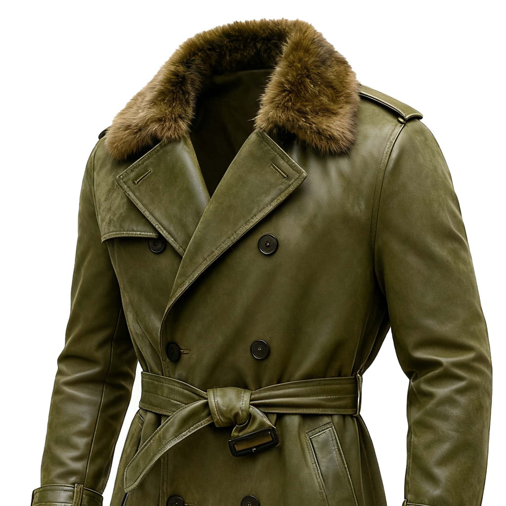 Men's Vintage Olive Green Leather Double-Breasted Fur Collar Trench Coat With Belted Waist