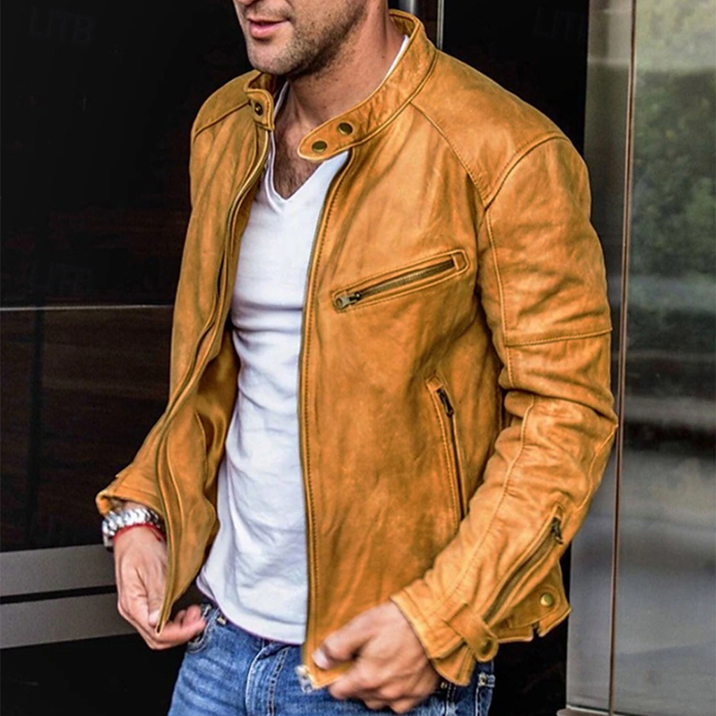 • Men's Fashion Stone Pattern Stand Collar Zipper Slim Fit Leather Jacket