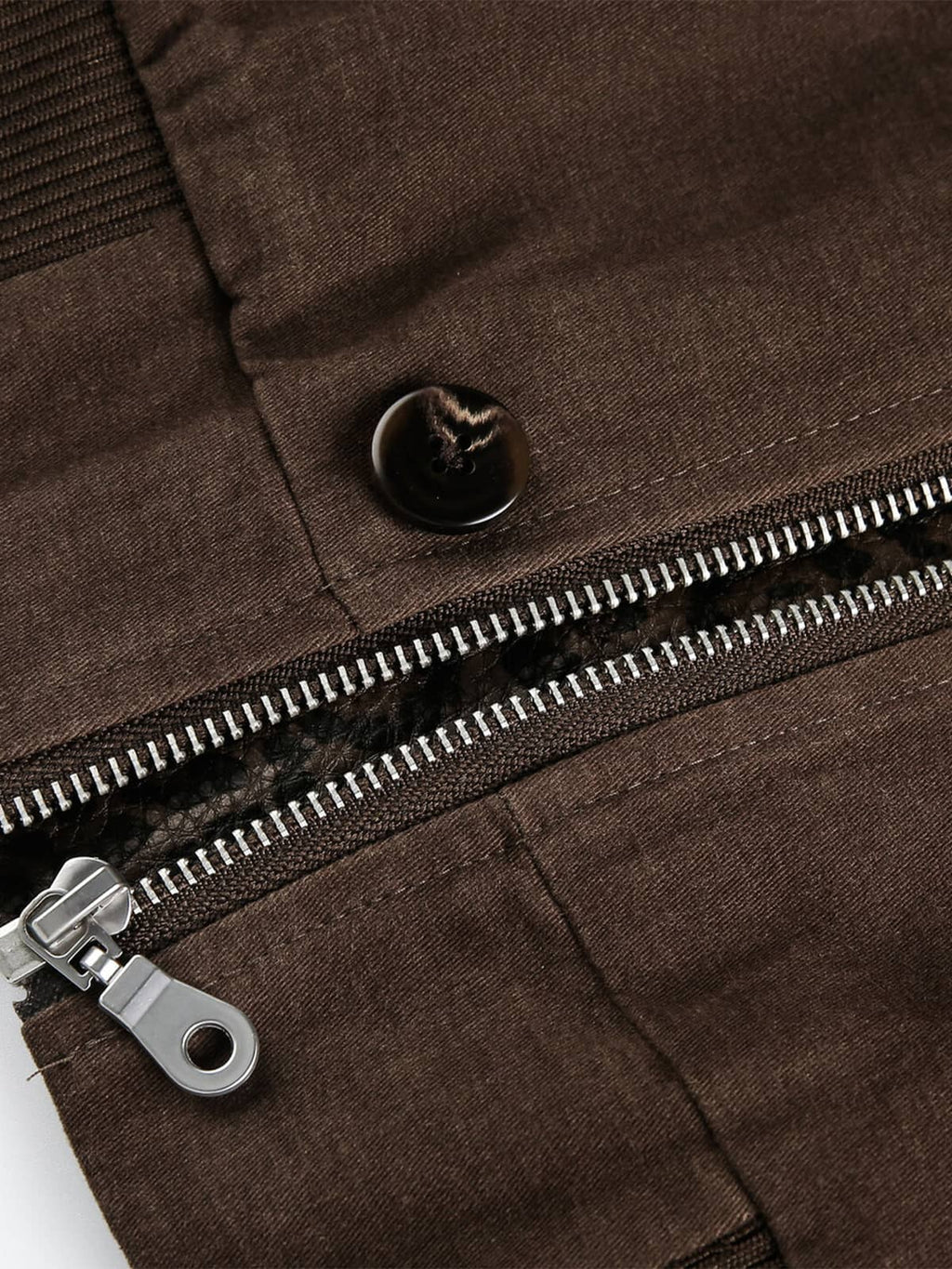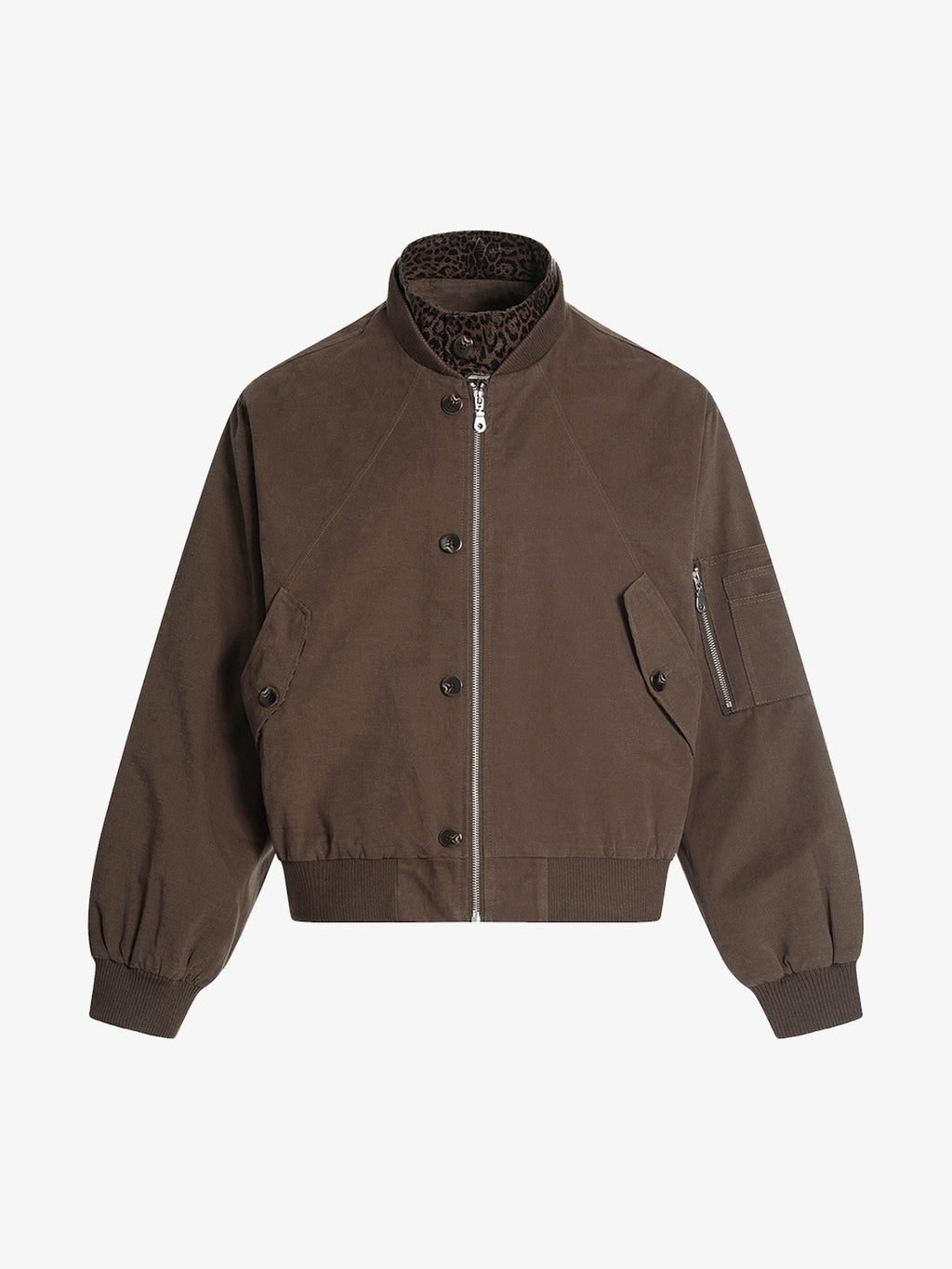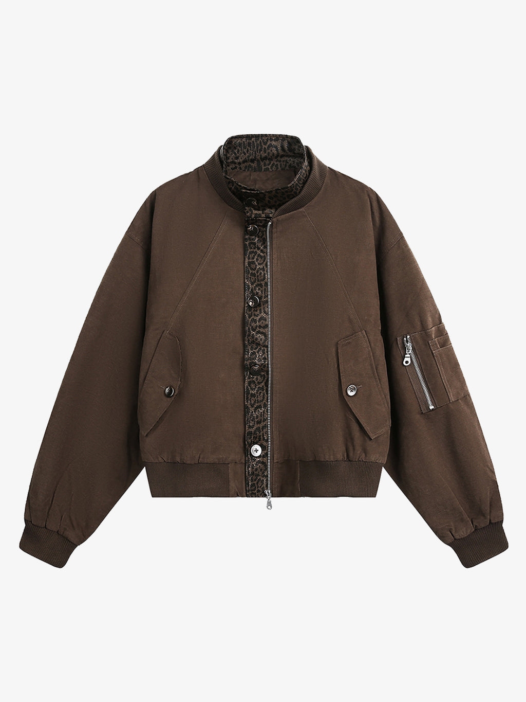 • Design Elements: Leopard print collar, front button closure, zippered arm pocket