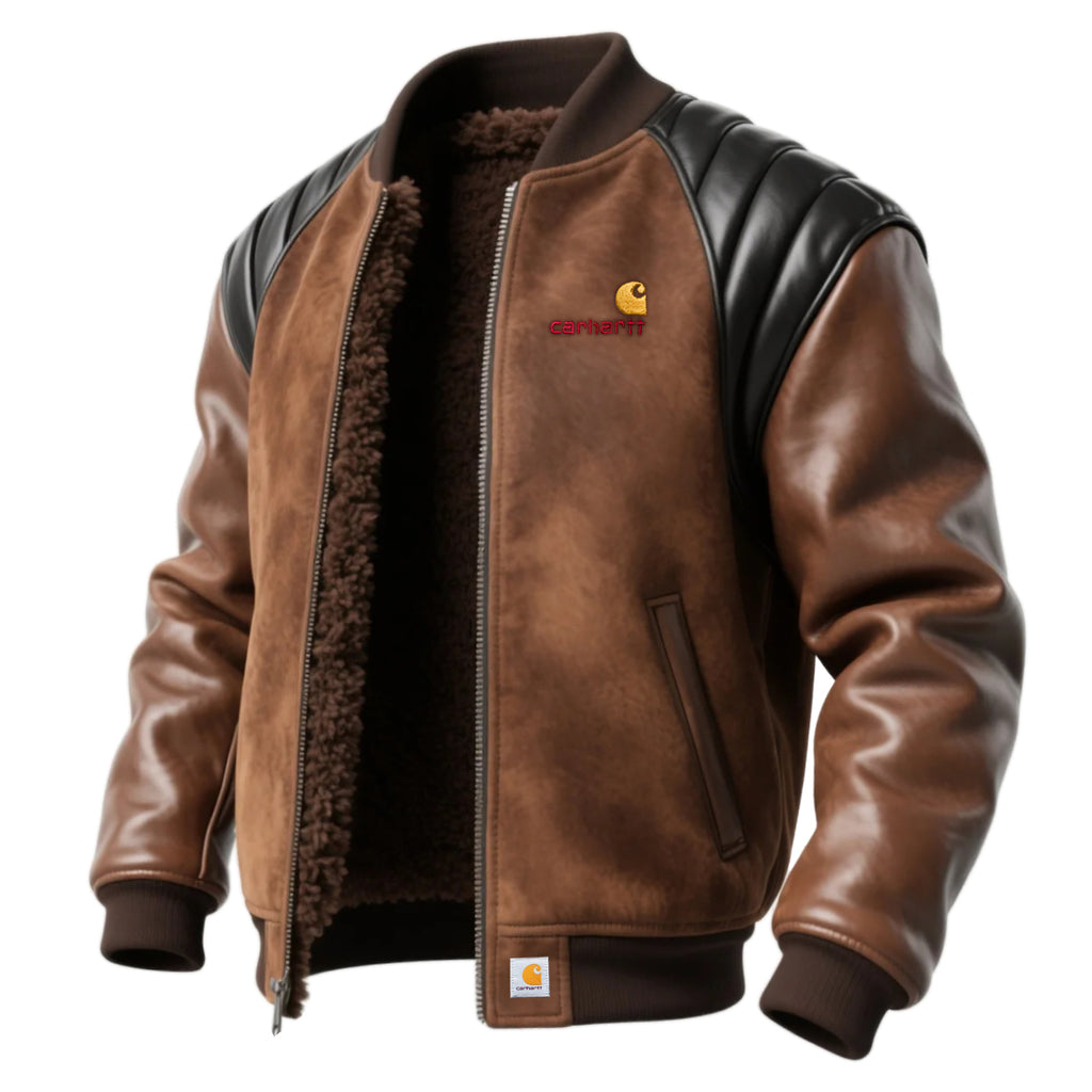 Men's Retro Suede Color Block Leather Baseball Collar Jacket With Fur Lining And Thick Stand Collar
