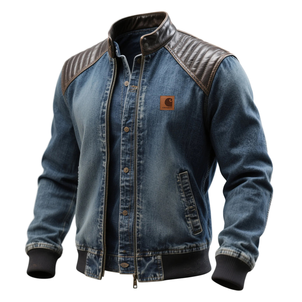 Men's Retro Denim Color Block Leather Collar Stand Collar Jacket Faux Two-Piece Outerwear