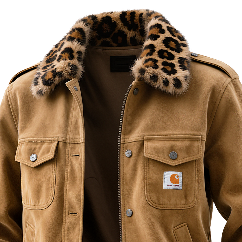• Design Elements: Leopard-print fur collar, front zipper closure, branded patch on chest pocket