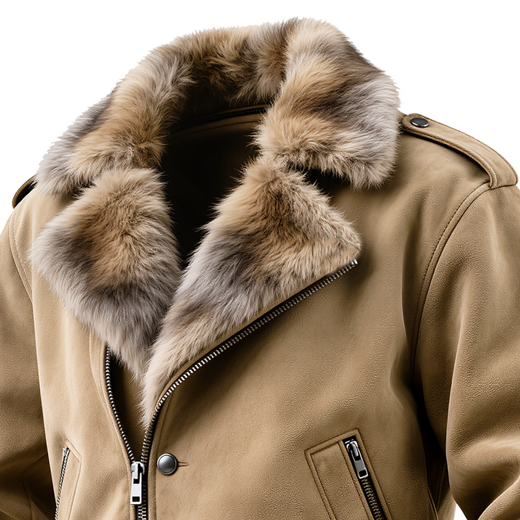 • Design Elements: Detachable fur collar, front zipper closure, ribbed cuffs and hem