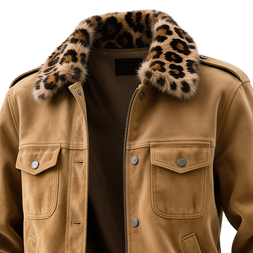 • Design Elements: Leopard print collar, front zipper closure, buttoned chest pockets