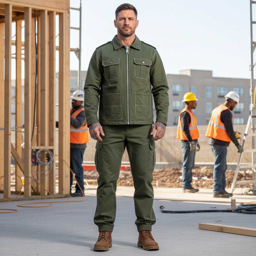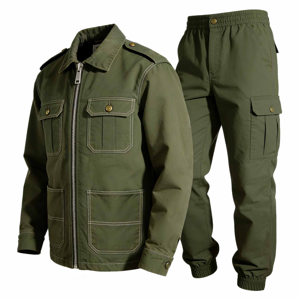 Men's Vintage Army Green Multi-Pocket Collar Jacket And Cargo Pants Set