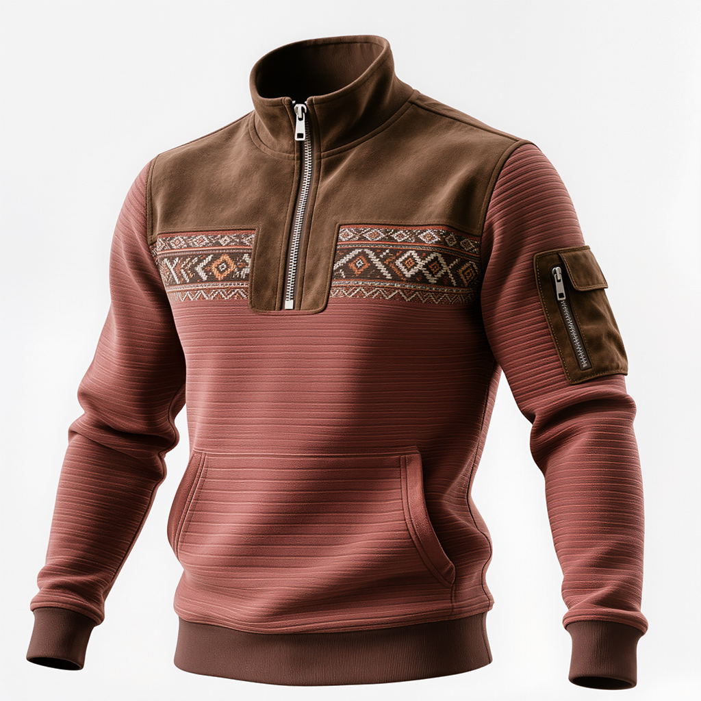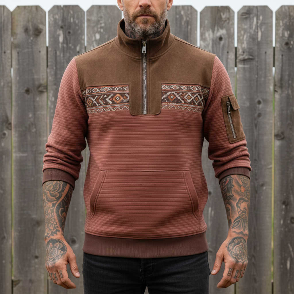 • Detail Features: Half-Zip Front Closure, Decorative Tribal Embroidery Panels, Zippered Arm Pocket, Ribbed Cuffs and Hem, Front Kangaroo Pocket
