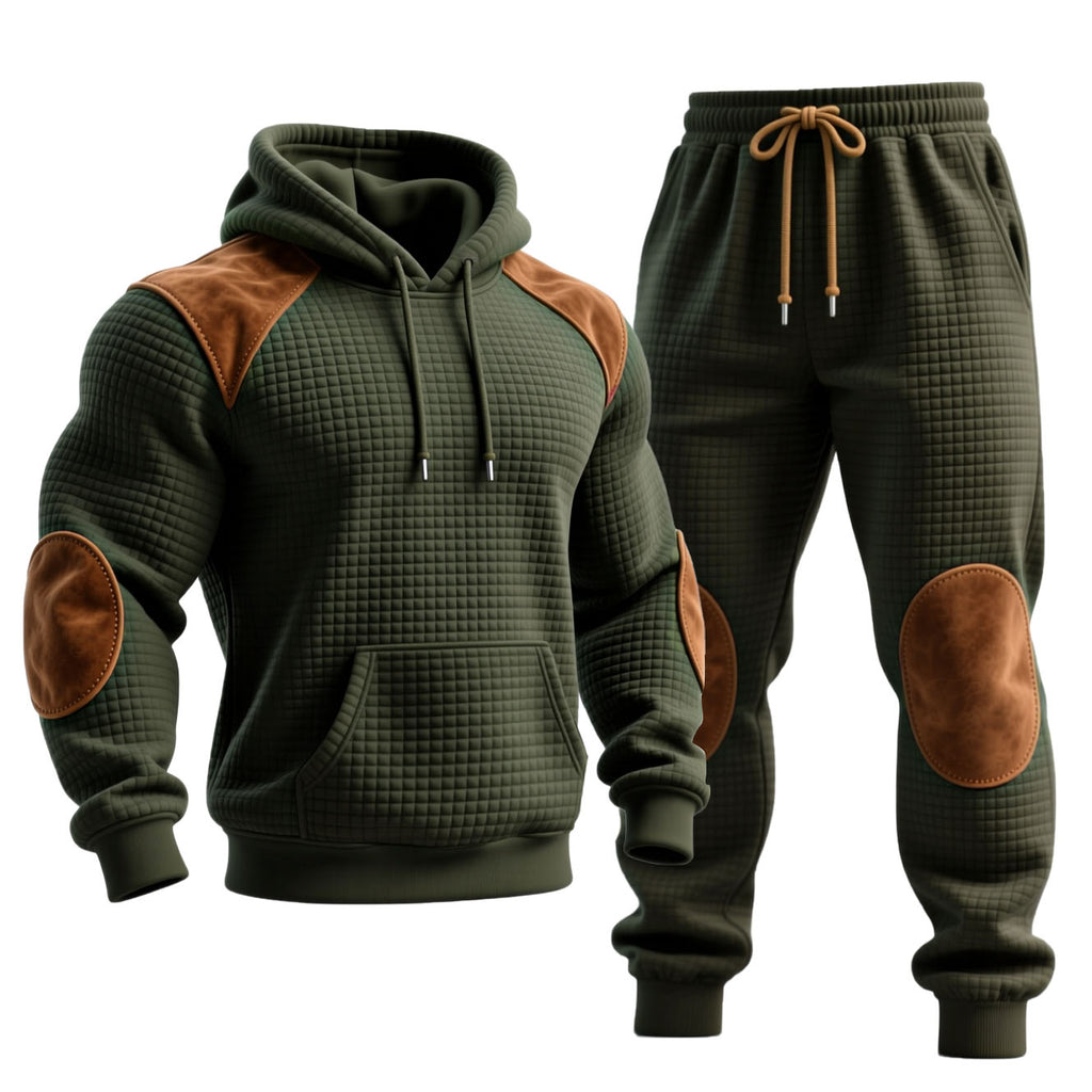 Men's Vintage Army Green Waffle Quilted Plaid Stitching Brown Suede Pocket Hoodie And Sweatpants Jogger Set