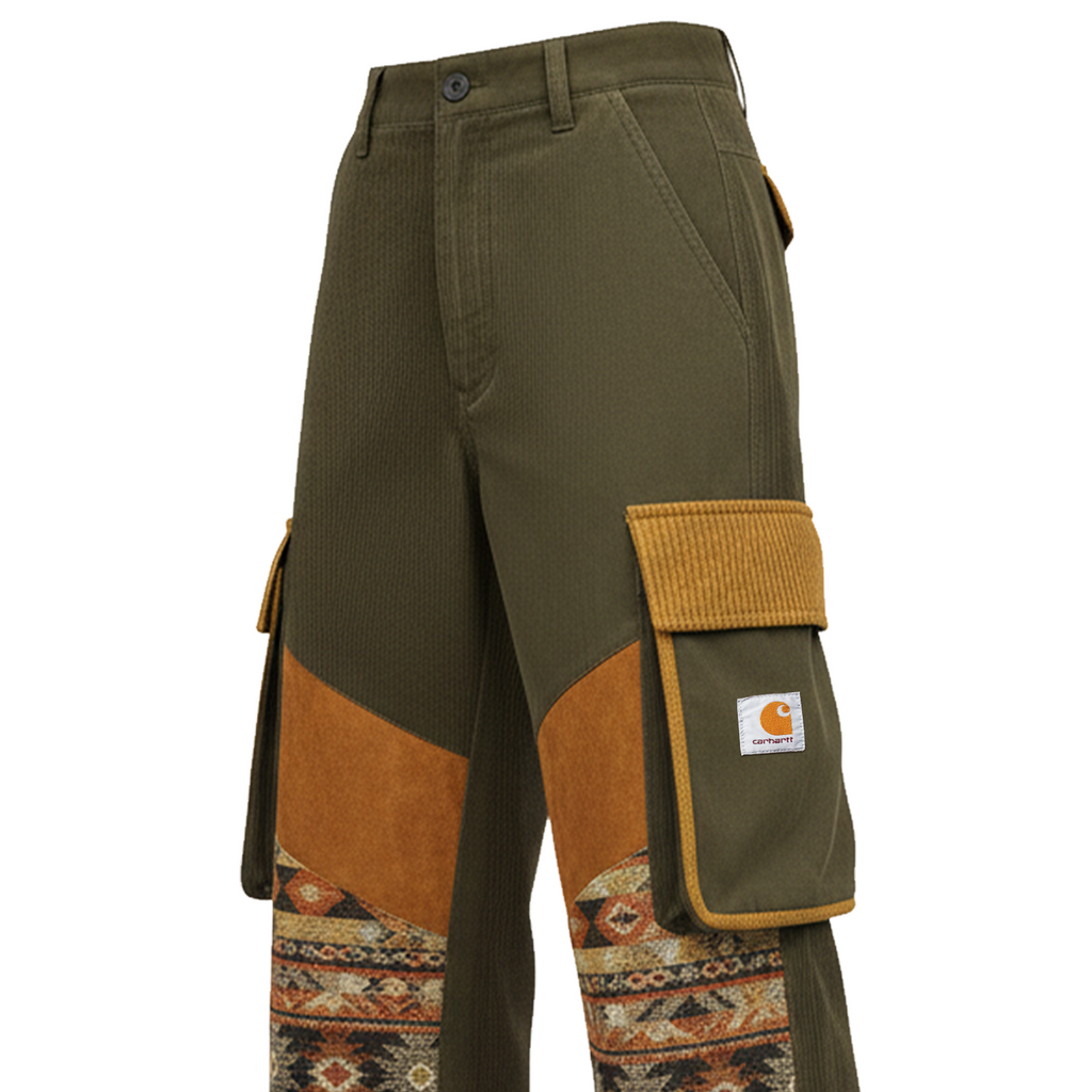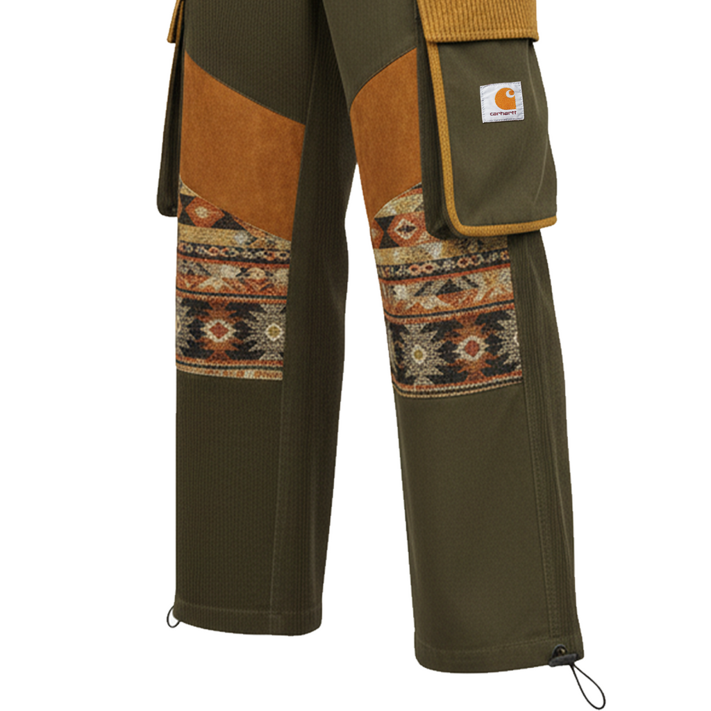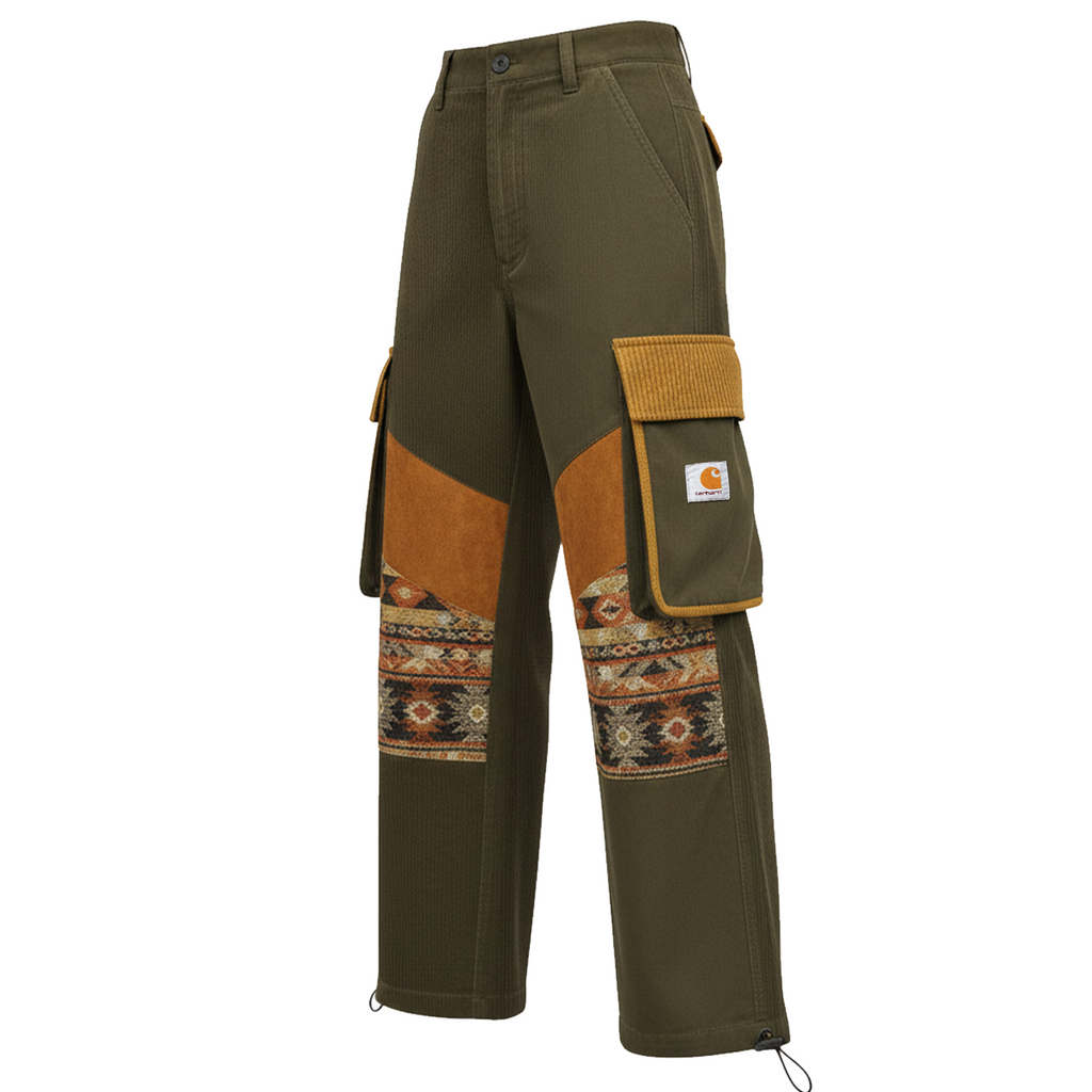 • Details: Multiple Cargo Pockets with Flap Closures, Decorative Tribal Pattern Panel on Lower Legs, Adjustable Drawstring at Ankle Hem