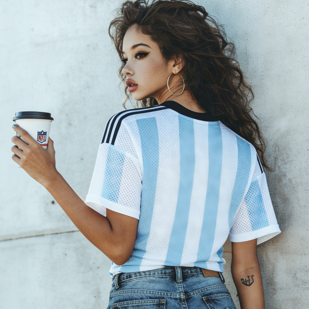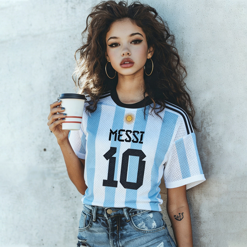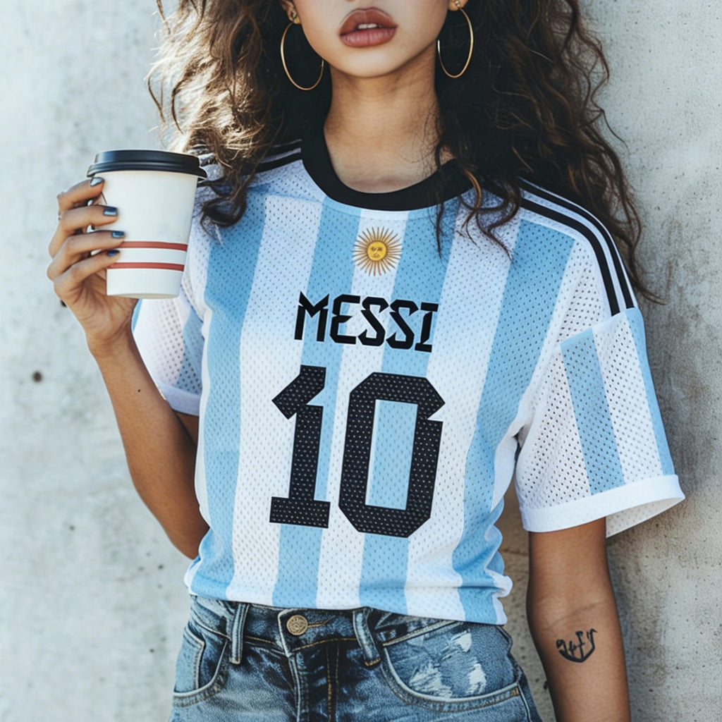 • Design Elements: Vertical light blue and white stripes, sun emblem at chest, "MESSI" name and "10" number print